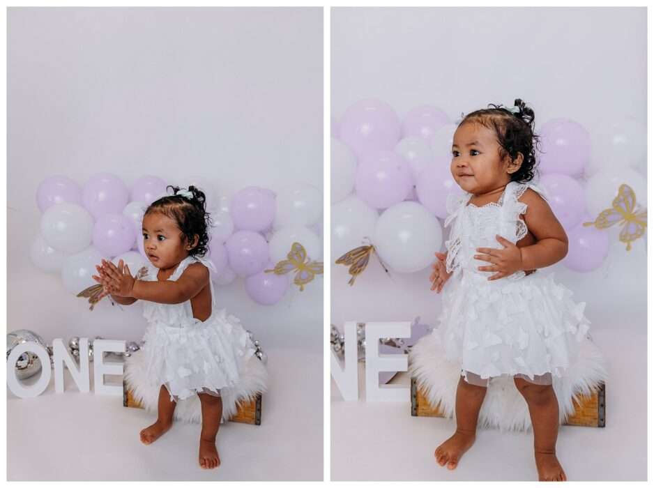 We designed the session with a playful, yet elegant theme in mind. Floating pastel and metallic balloons created the perfect backdrop, while hand-cut butterfly accents “flew” across the set to add movement and a touch of enchantment. A purple ombré rosette cake sat center stage, ready for tiny fingers and curious hands to explore.