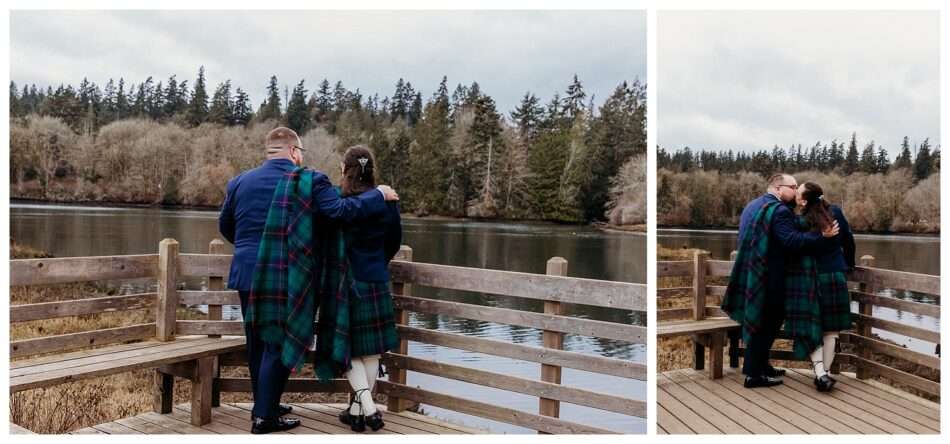 After the ceremony, we headed to Blakely Harbor Park for portraits. The shift from courthouse walls to open skies and lush greenery was perfect. The harbor’s calm water, tall trees, and rustic textures offered a romantic, natural backdrop that paired beautifully with the grooms’ formal kilts and heartfelt connection.